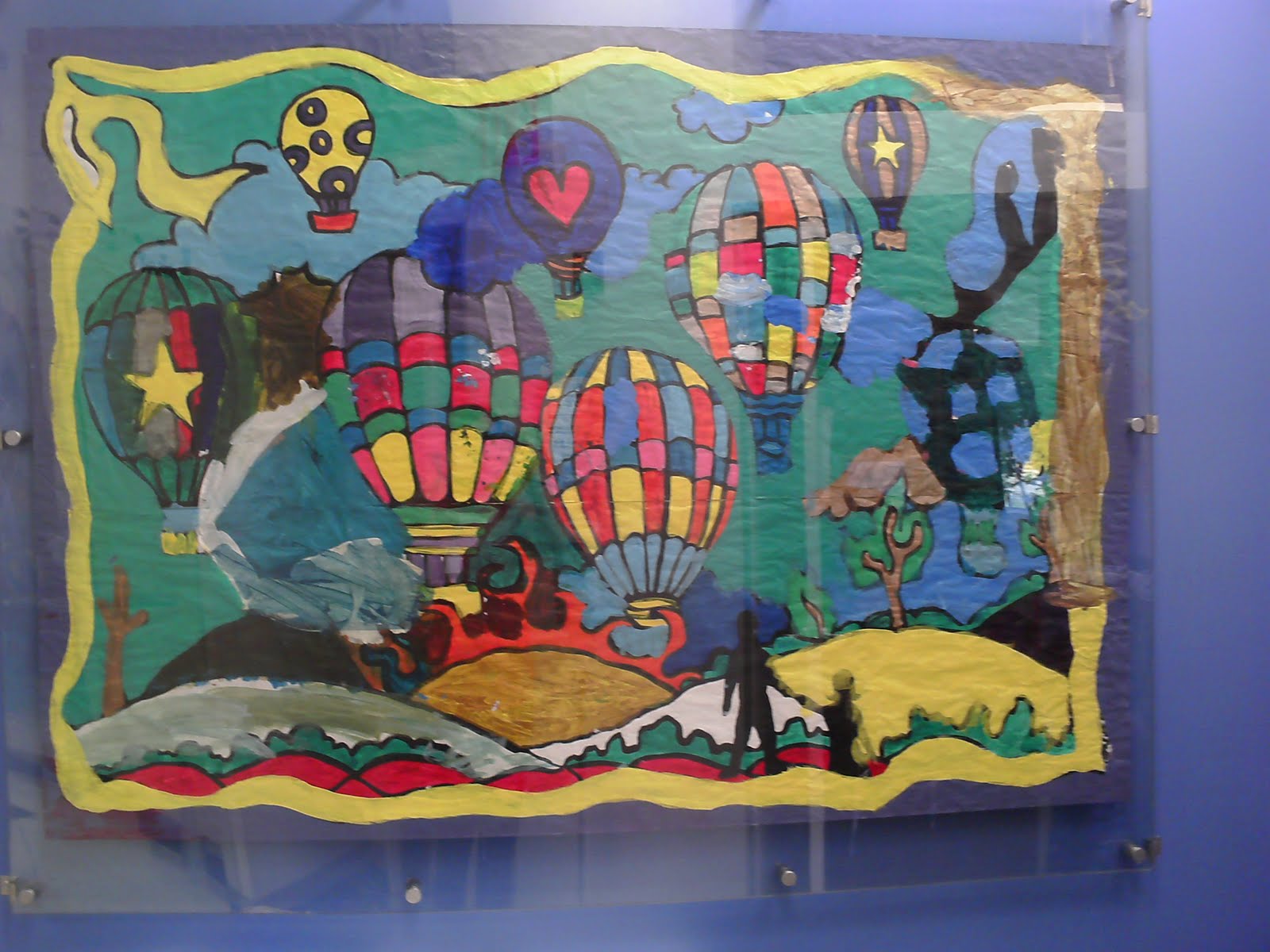 Here are a few pictures from the last mural that we did at the hospital. It is displayed in the front area of the “Zone” – which is our therapeutic play space. I sketched out the hot air balloon design, and then the mural was painted by a 5 year old patient. While painting she learned to mix her own colors and now refers to various blues by names such as: periwinkle, cobalt, and cyan. Amazing! I will post pictures of the current hospital mural soon.