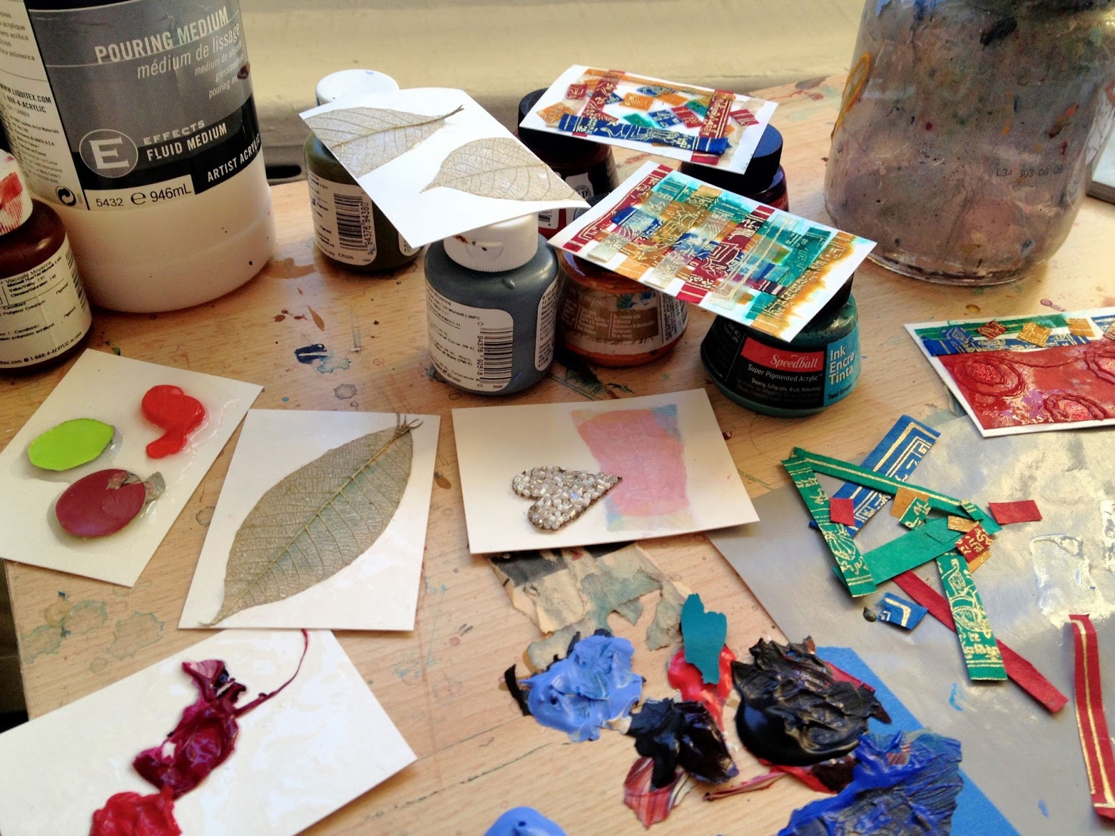 I enjoyed working on the foundation for a number of cards at once. As usual I worked intuitively with the materials and imagery. I looked around my studio for mod podge but couldn’t find it, so I ended up using the Elmer’s clear glue (best find of the year!) I used a small palette knife to spread the glue and then covered each collage with a thin layer of the glue as I would with mod podge to serve as a protective layer and sealant.