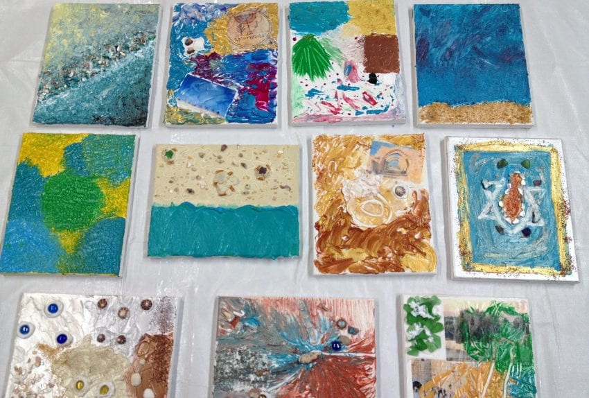 One of the finished textural pieces: sand, sea glass, shells, molding paste, & paint Last week I led an art workshop for a fantastic group of teens from Temple Shaaray Tefila in NYC. These teens are participating in a program called Gateways and Tents, which is a partnership between Shaaray Tefila and Ohel Avraham – their sister temple in Israel....